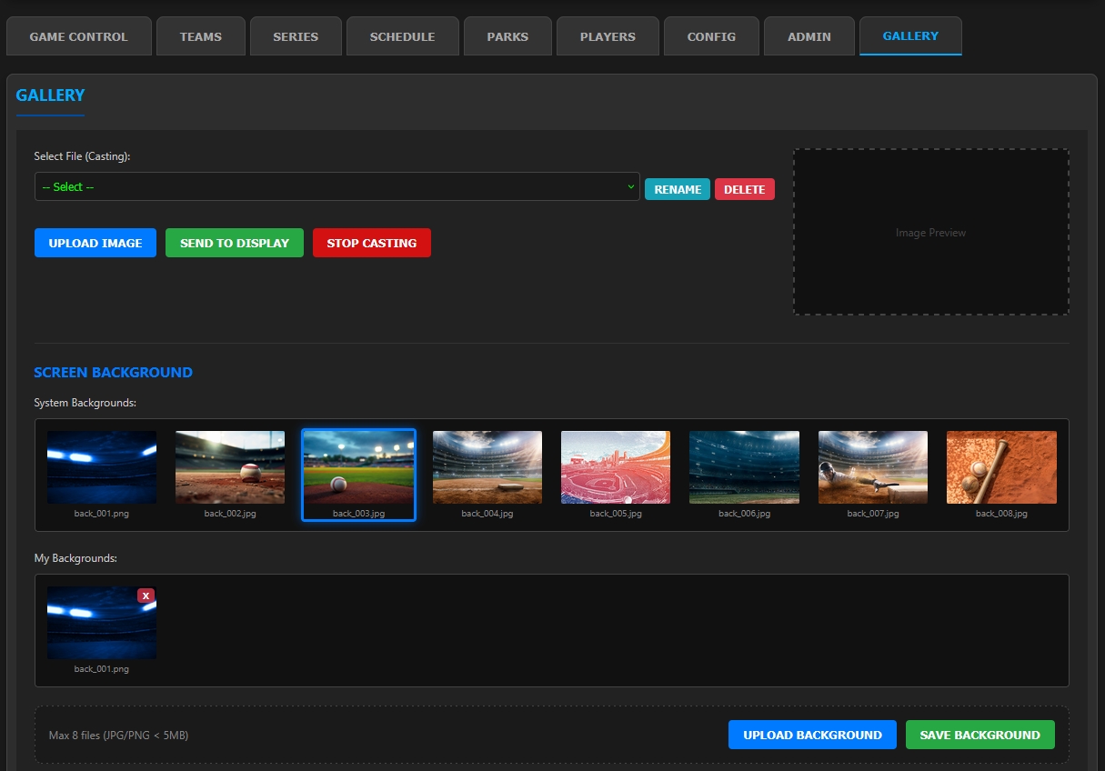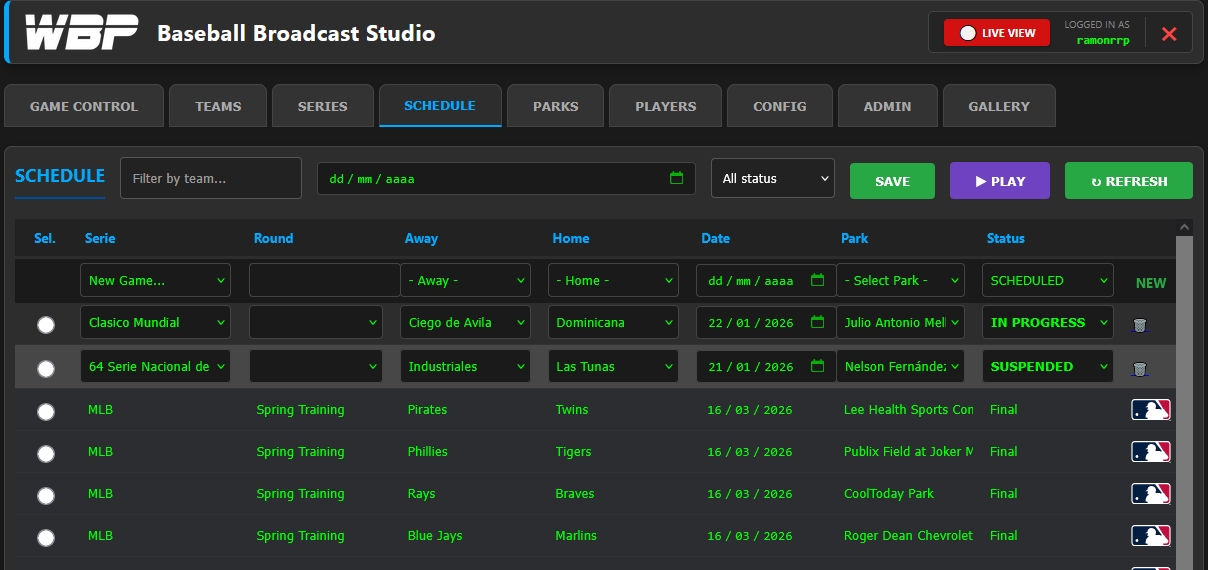 La configuración de la pantalla se hace en el Panel. Si vas a transmitir un juego automatizado (Grandes Ligas, Ligas Invernales, Series del Caribe y Clásico Mundial) tienes que ir a la pestaña SCHEDULE, donde aparecen los partidos del día. En el almanaque arriba puedes seleccionar la fecha que desees. A la izquierda (en el círculo blanco, seleccionas el partido deseado y luego le das al botón PLAY.