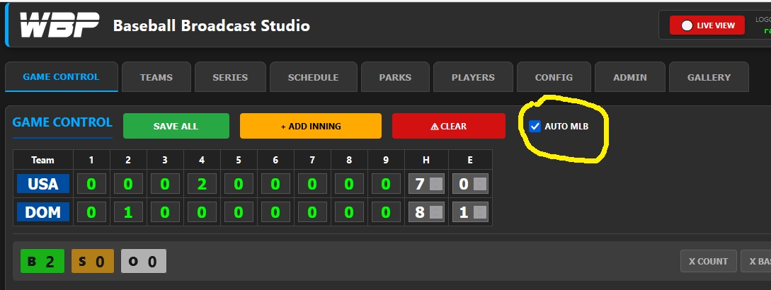 Cuando es un partido con actualización automática, en la pestaña GAME CONTROL recomendamos que el botón check box: AUTO MLB esté activado.